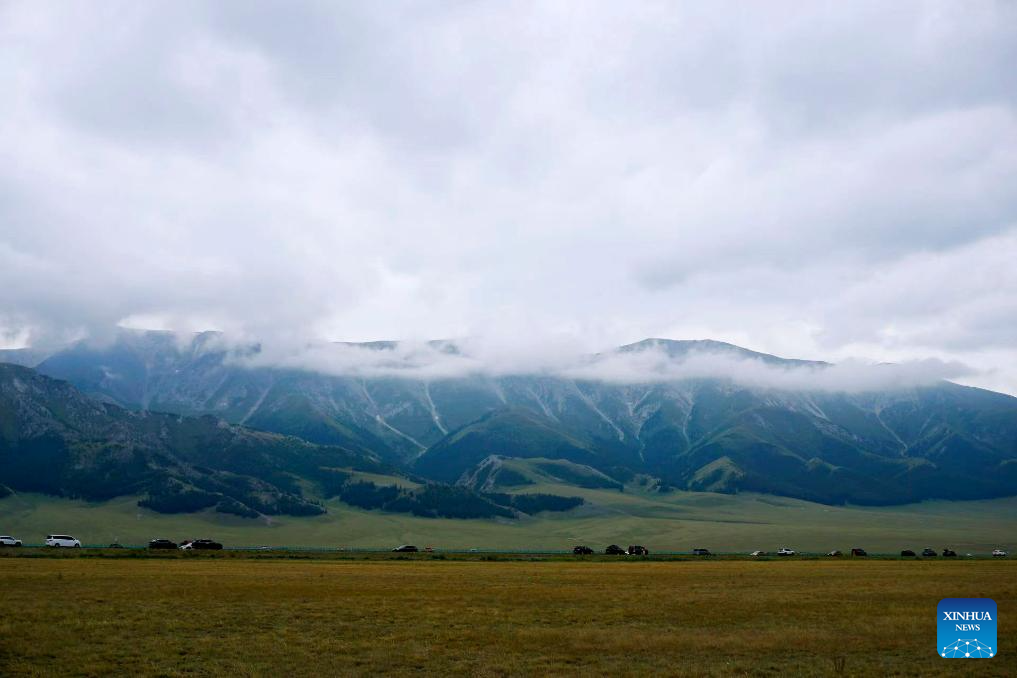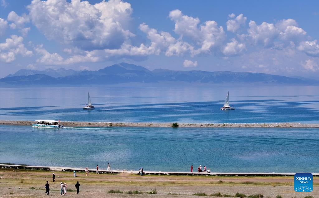 This photo taken on July 16, 2025 shows a view of Sayram Lake scenic area in Bortala Mongolian Autonomous Prefecture, northwest China's Xinjiang Uygur Autonomous Region. Nestled in the Tianshan Mountains, Sayram Lake, Xinjiang's highest and largest alpine lake, has entered its peak tourist season in midsummer. (Xinhua/Xu Xiaoxuan)