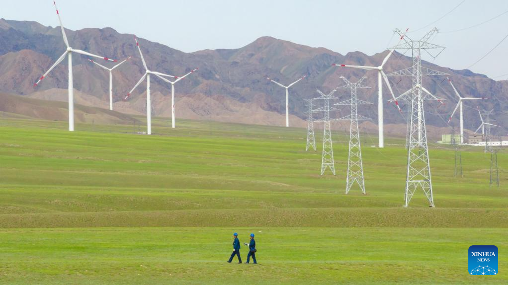 Staff members of State Grid Bortala Electric Power Supply Company patrol at Sayram Lake scenic area to ensure power supply in Bortala Mongolian Autonomous Prefecture, northwest China's Xinjiang Uygur Autonomous Region, July 16, 2025. Nestled in the Tianshan Mountains, Sayram Lake -- Xinjiang's highest and largest alpine lake -- has emerged as a trailblazer in sustainable tourism after achieving full renewable-powered operations in July 2022. The pristine lake, a key ecological and cultural asset, has seen visitor numbers climb steadily ever since.