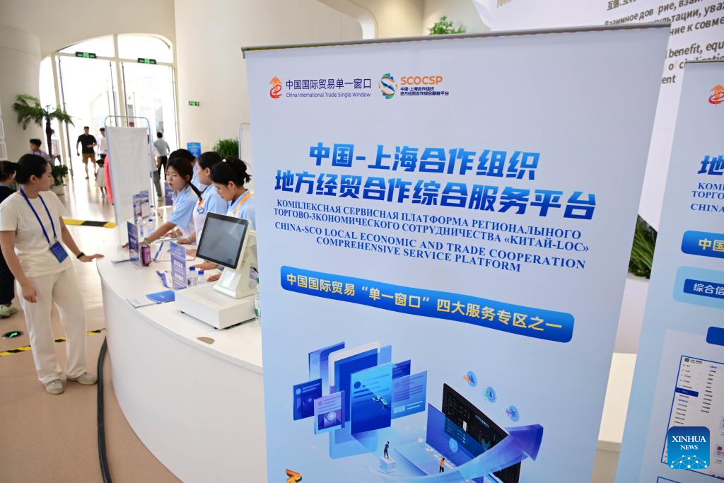 Staff members of China-Shanghai Cooperation Organization (SCO) Local Economic and Trade Cooperation Comprehensive Service Platform introduce the platform during the 2025 SCO International Investment and Trade Expo in Qingdao, east China's Shandong Province, July 18, 2025. Under the theme "Sharing New Opportunities, Seeking New Common Development," the expo kicked off on Friday in Qingdao. (Xinhua/Li Ziheng)