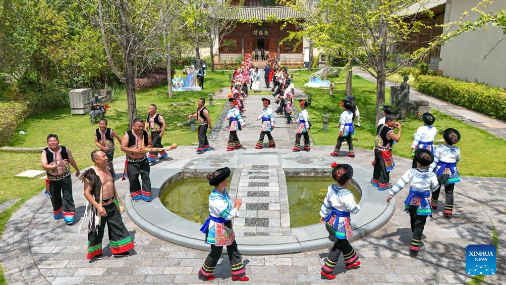 A drone photo taken on July 18, 2025 shows members of a local Yizu Dage team attending a rehearsal in Weishan Yi and Hui Autonomous County, Dali Bai Autonomous Prefecture, southwest China's Yunnan Province. Yizu Dage, a traditional folk art of the Yi ethnic group usually performed during festivals, weddings, funerals and other gathering occasions, has a history of about 10 centuries and was listed as a national-level intangible cultural heritage in 2008. Weishan is dubbed "cradle of Yizu Dage."