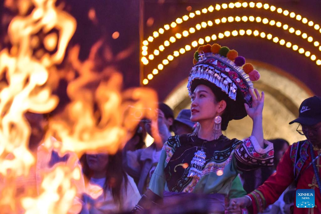 Members of a local Yizu Dage team dance with tourists during a parade show on a square in Weishan Yi and Hui Autonomous County, Dali Bai Autonomous Prefecture, southwest China's Yunnan Province, July 18, 2025. Yizu Dage, a traditional folk art of the Yi ethnic group usually performed during festivals, weddings, funerals and other gathering occasions, has a history of about 10 centuries and was listed as a national-level intangible cultural heritage in 2008. Weishan is dubbed "cradle of Yizu Dage."