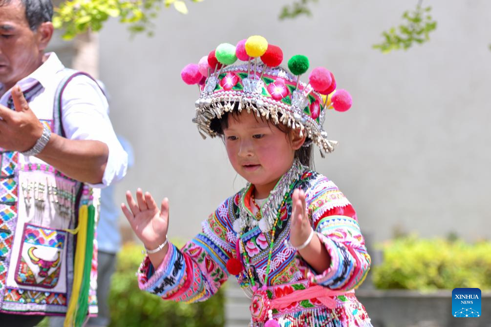 A young member of a local Yizu Dage team attends a rehearsal in Weishan Yi and Hui Autonomous County, Dali Bai Autonomous Prefecture, southwest China's Yunnan Province, July 18, 2025. Yizu Dage, a traditional folk art of the Yi ethnic group usually performed during festivals, weddings, funerals and other gathering occasions, has a history of about 10 centuries and was listed as a national-level intangible cultural heritage in 2008. Weishan is dubbed "cradle of Yizu Dage."