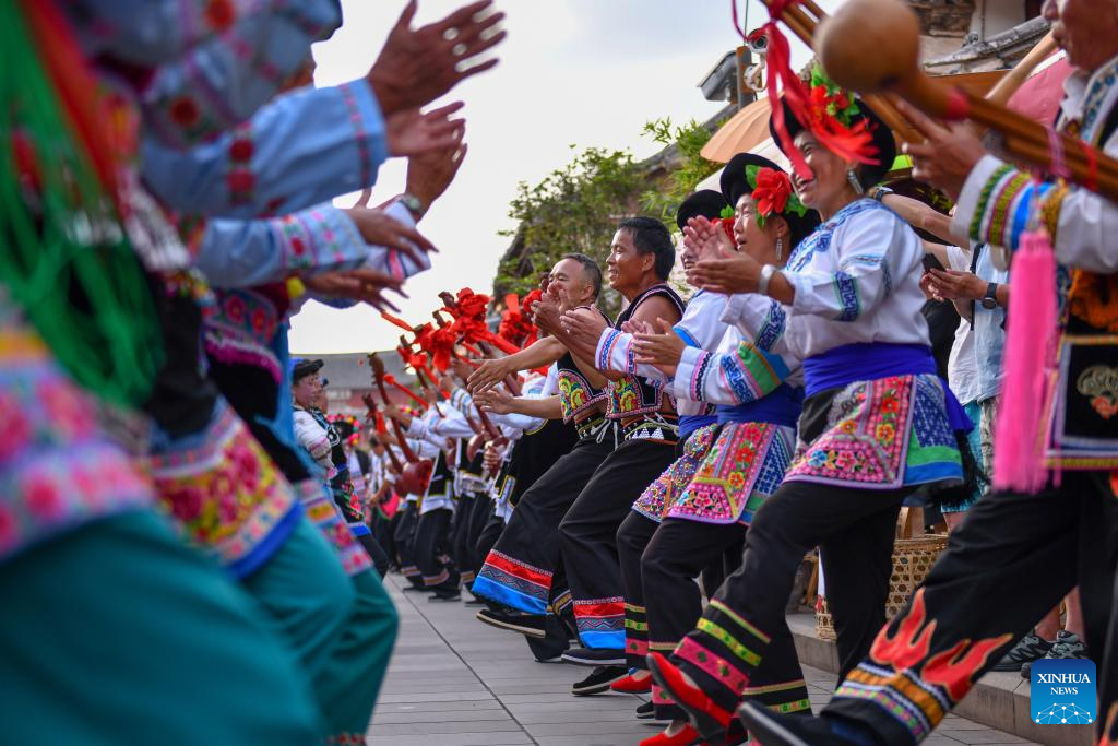 Members of a local Yizu Dage team perform during a parade show on the ancient street of Nanzhao in Weishan Yi and Hui Autonomous County, Dali Bai Autonomous Prefecture, southwest China's Yunnan Province, July 18, 2025. Yizu Dage, a traditional folk art of the Yi ethnic group usually performed during festivals, weddings, funerals and other gathering occasions, has a history of about 10 centuries and was listed as a national-level intangible cultural heritage in 2008. Weishan is dubbed "cradle of Yizu Dage."