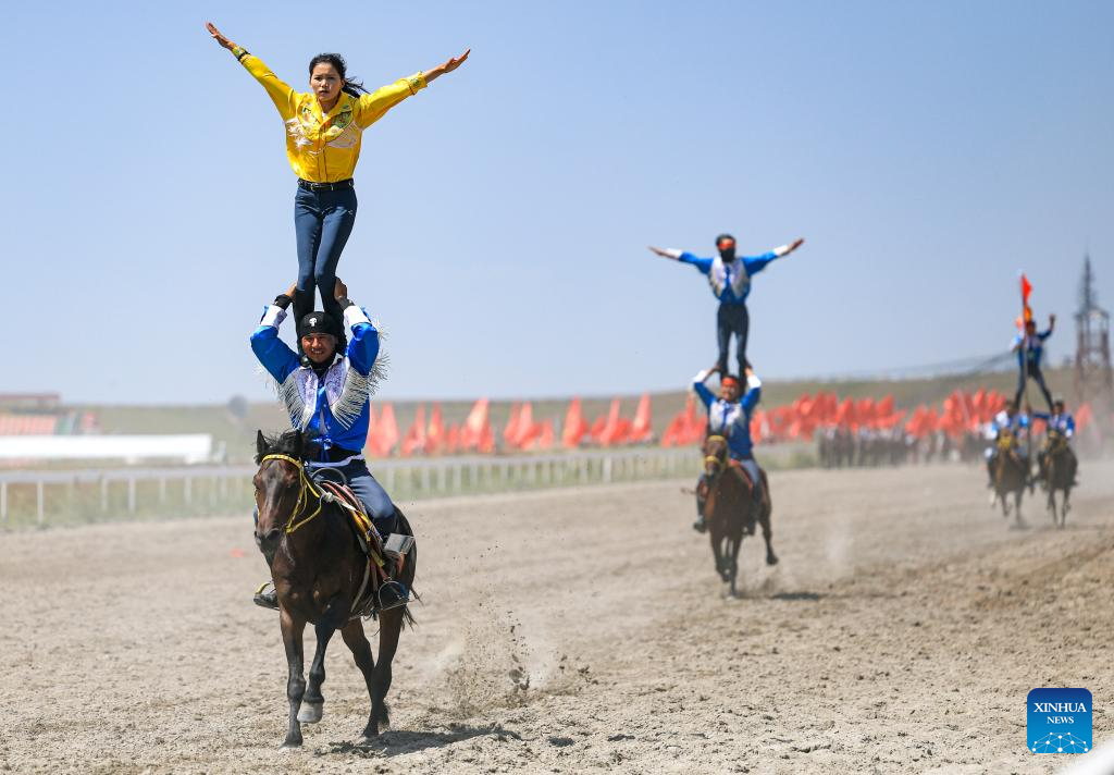 An equestrian show is staged during a tourism festival in Zhaosu, northwest China's Xinjiang Uygur Autonomous Region, July 19, 2025. (Xinhua/Wang Fei)