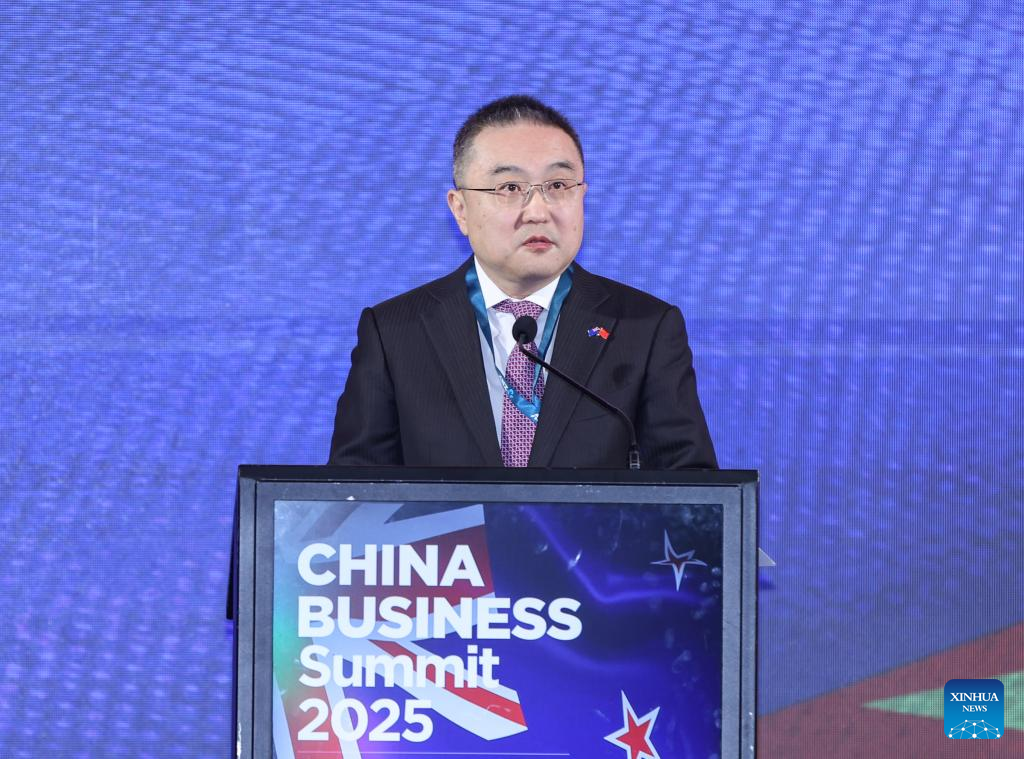 Chinese Ambassador to New Zealand Wang Xiaolong addresses the China Business Summit 2025 in Auckland, New Zealand, July 18, 2025. The China Business Summit 2025 was held in Auckland on Friday. (Xinhua/Long Lei)