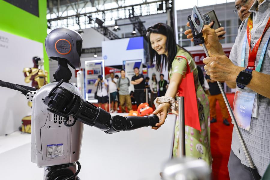 A visitor shakes hand with a humanoid robot at the Digital Technology Chain area of the third China International Supply Chain Expo (CISCE) in Beijing, capital of China, July 19, 2025. (Xinhua/Chang Nengjia)