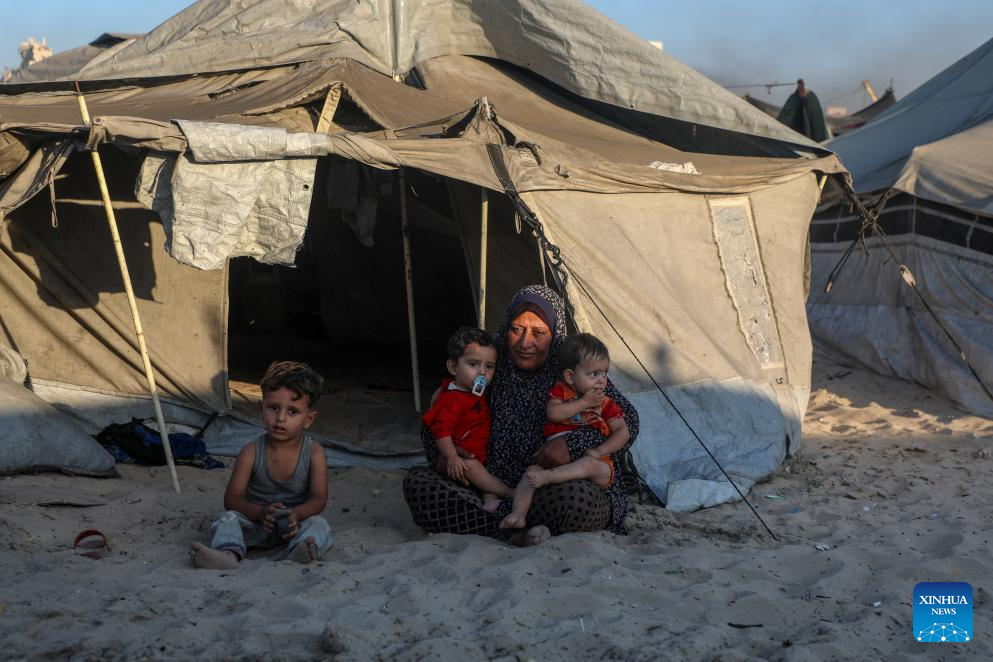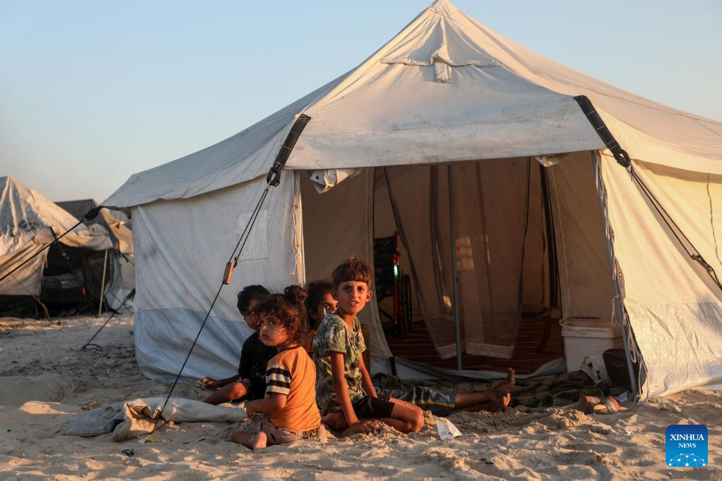 Palestinian children are seen among tents for displaced people on the shores of Gaza City, on July 18, 2025. (Photo by Rizek Abdeljawad/Xinhua)
