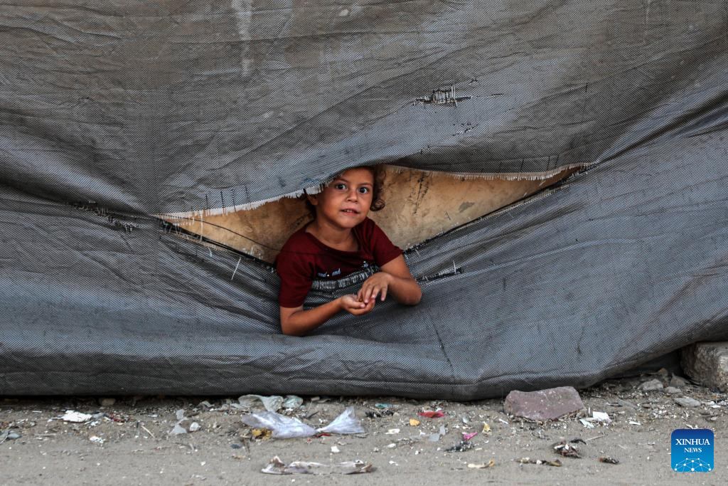A Palestinian child is seen in a tent for displaced people on the shores of Gaza City, on July 18, 2025. (Photo by Rizek Abdeljawad/Xinhua)