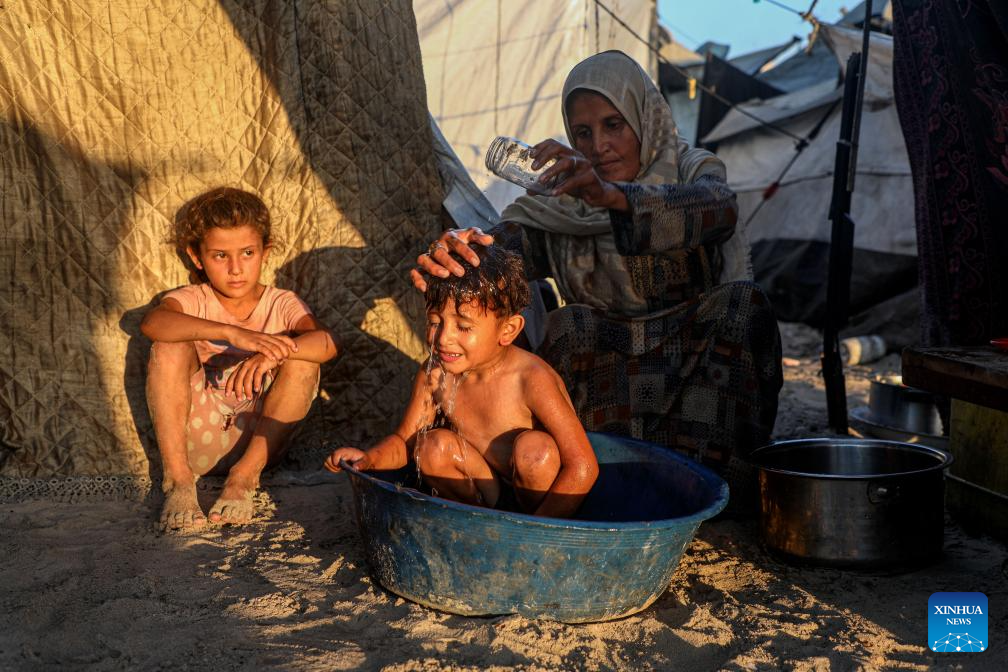 A Palestinian child takes a bath among tents for displaced people on the shores of Gaza City, on July 18, 2025. (Photo by Rizek Abdeljawad/Xinhua)