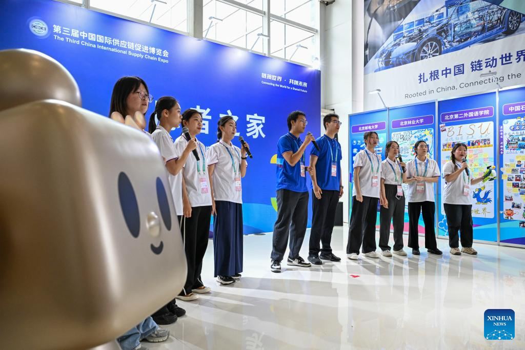 A volunteer provides services for a visitor at the third China International Supply Chain Expo (CISCE) in Beijing, capital of China, July 20, 2025. Volunteers from universities like Central University of Finance and Economics, Beijing Foreign Studies University, Minzu University of China, and Beijing International Studies University are involved in the third CISCE, which scheduled from July 16 to 20. (Xinhua/Chen Shuo)