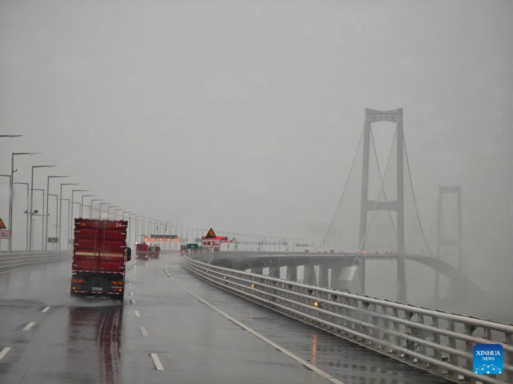 Vehicles of the Shenzhen fire and rescue department head for Zhanjiang on the Shenzhen-Zhongshan link ahead Typhoon Wipha's landfall in south China's Guangdong Province, July 20, 2025. Typhoon Wipha, the sixth typhoon of the year, made landfall near Jiangmen City in south China's Guangdong Province around 5:50 p.m. on Sunday, according to the Guangdong provincial meteorological observatory.