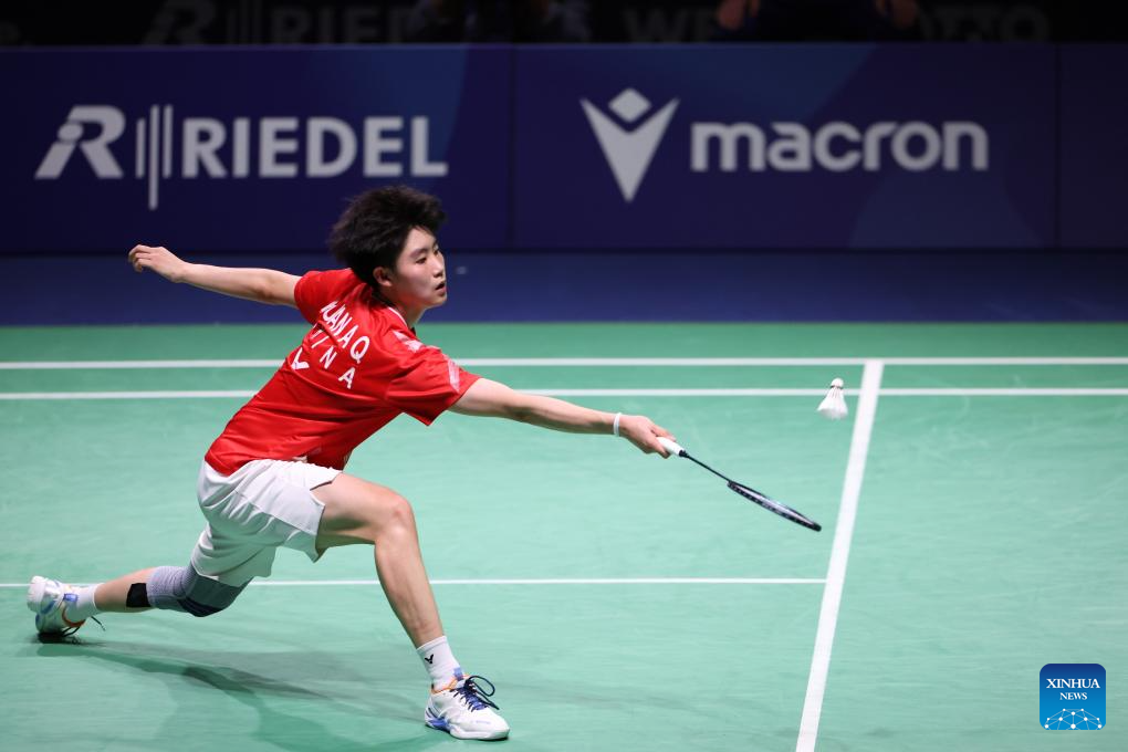 Yuan Anqi of China competes during the women's singles match of the badminton mixed team final match between China and Chinese Taipei at the Rhine-Ruhr 2025 FISU World University Games in Muelheim, Germany, July 20, 2025. (Xinhua/Zhang Fan)