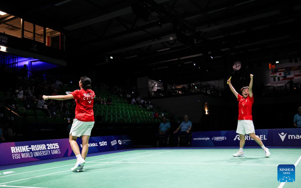 Liu Jiayue (R)/Wang Yiduo of China celebrate after the women's doubles match of the badminton mixed team final match between China and Chinese Taipei at the Rhine-Ruhr 2025 FISU World University Games in Muelheim, Germany, July 20, 2025. (Xinhua/Hu Xingyu)