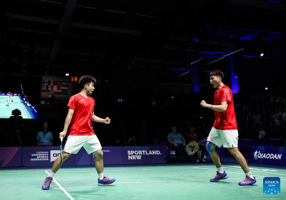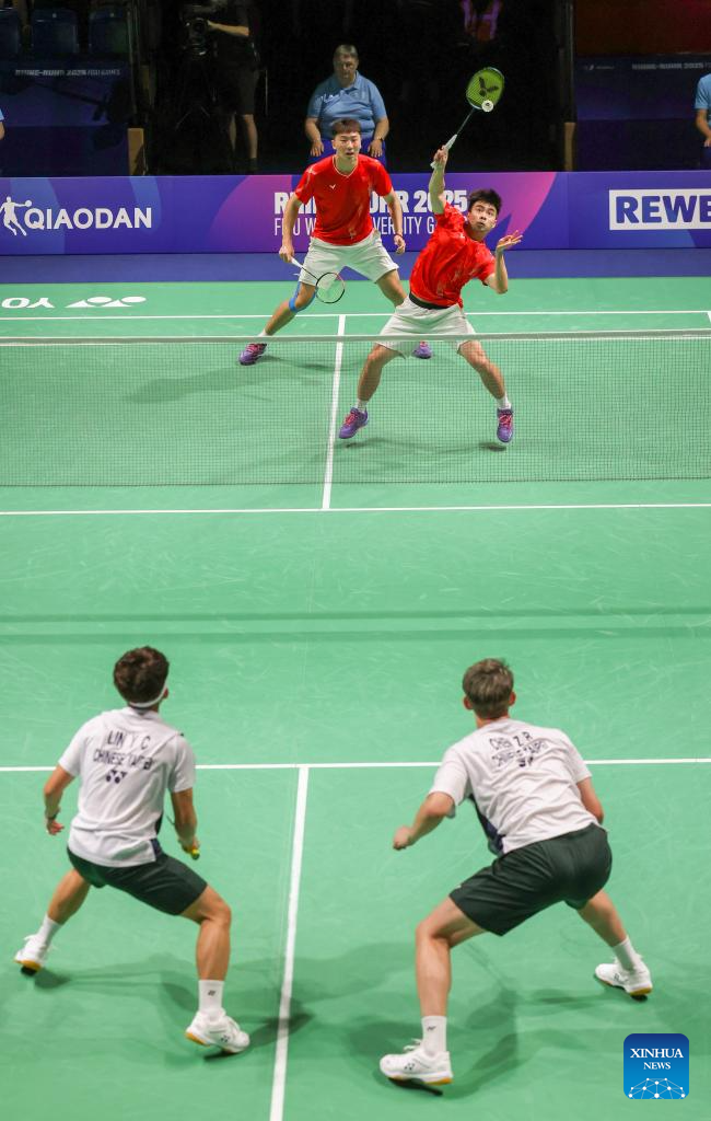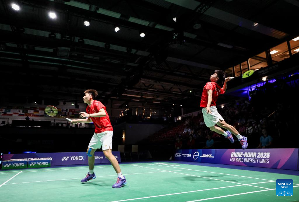 Cui Hechen (L)/Peng Jianqin of China compete during the men's doubles match of the badminton mixed team final match between China and Chinese Taipei at the Rhine-Ruhr 2025 FISU World University Games in Muelheim, Germany, July 20, 2025. (Xinhua/Hu Xingyu)