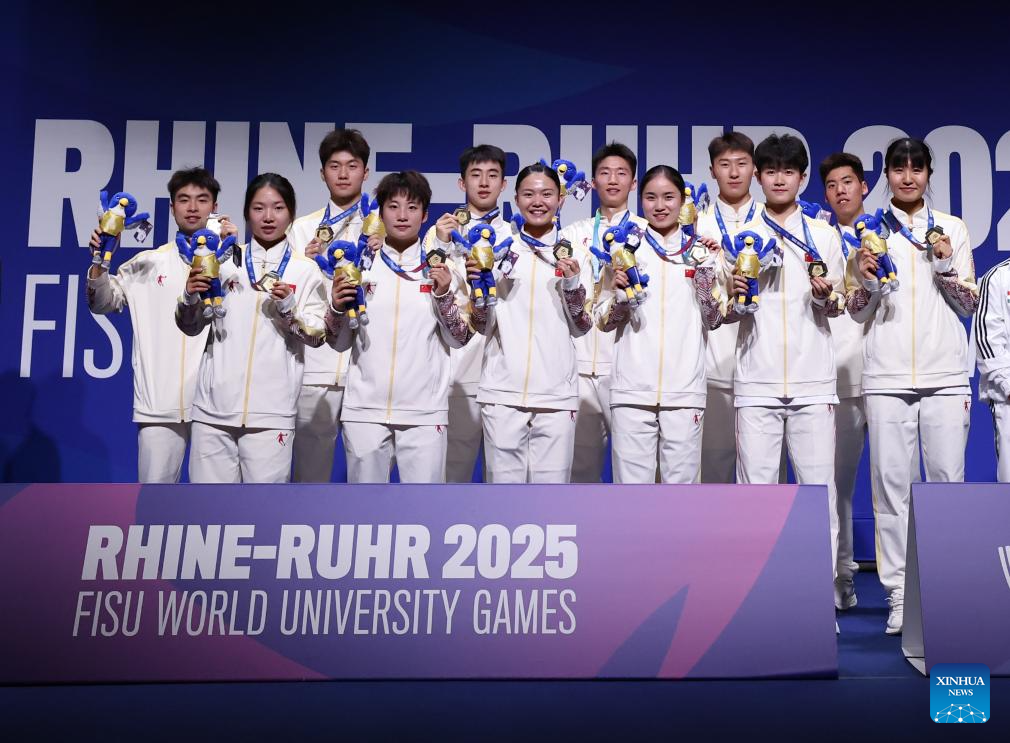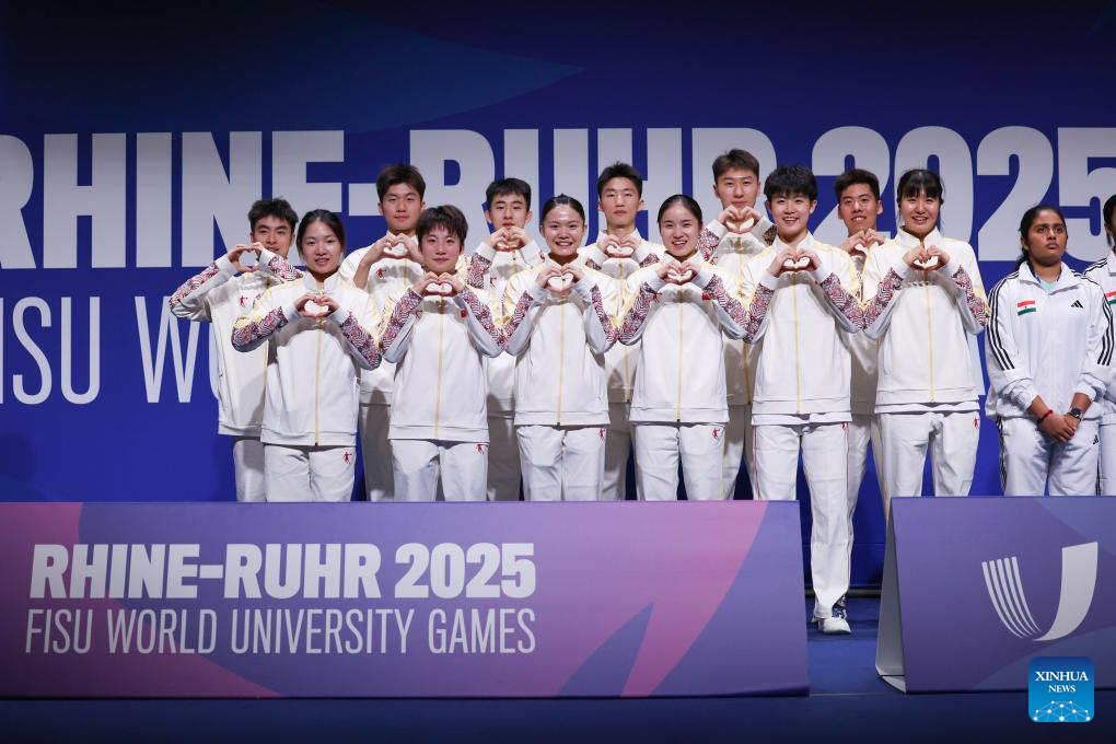 Members of team China celebrate during the awarding ceremony after the badminton mixed team final match between China and Chinese Taipei at the Rhine-Ruhr 2025 FISU World University Games in Muelheim, Germany, July 20, 2025. (Xinhua/Zhang Fan)