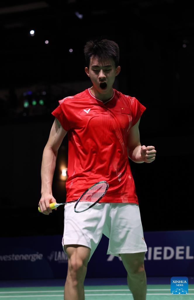 Wang Zijun of China celebrates during the men's singles match of the badminton mixed team final match between China and Chinese Taipei at the Rhine-Ruhr 2025 FISU World University Games in Muelheim, Germany, July 20, 2025. (Xinhua/Zhang Fan)