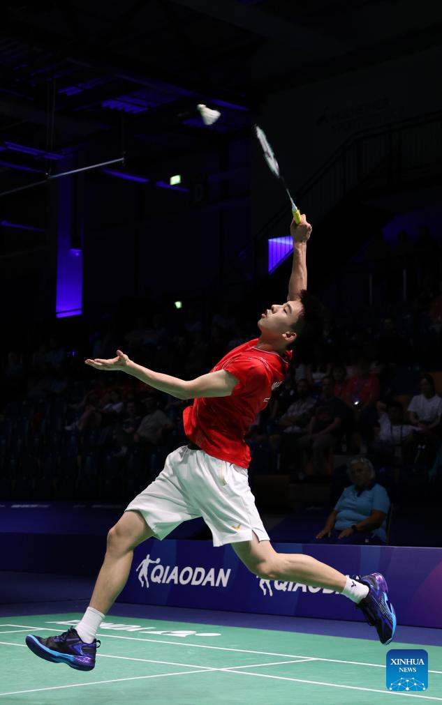 Wang Zijun of China competes during the men's singles match of the badminton mixed team final match between China and Chinese Taipei at the Rhine-Ruhr 2025 FISU World University Games in Muelheim, Germany, July 20, 2025. (Xinhua/Zhang Fan)