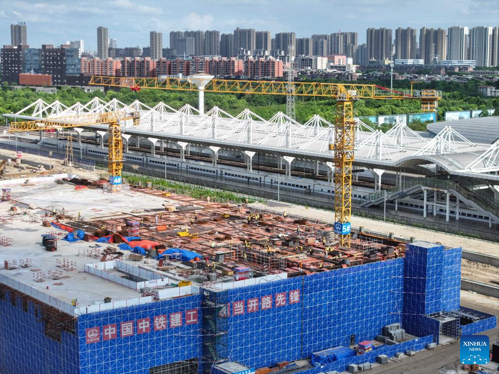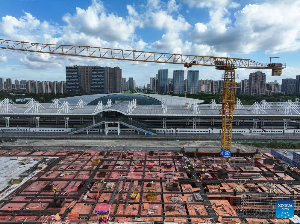 An aerial drone photo shows the construction site of the Nantong Railway Station in Nantong, east China's Jiangsu Province, July 21, 2025. The station is along a high-speed railway linking Shanghai, Nanjing of Jiangsu Province and Hefei of Anhui Province in east China. (Xinhua/Ji Chunpeng)