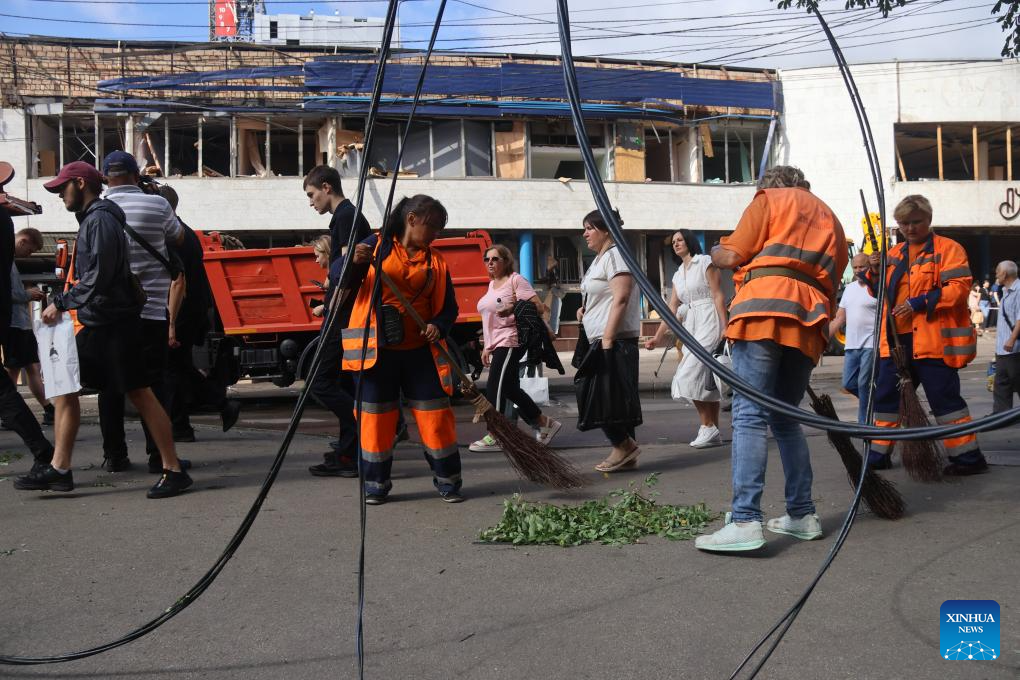 Staff members clean the road near a metro station after an air strike in the Shevchenkivskyi district of Kiev, Ukraine, July 21, 2025. Two people were killed and 15 others injured in a wave of Russian missile and drone strikes on Ukraine's capital and the western region of Ivano-Frankivsk early Monday, said Ukrainian authorities.