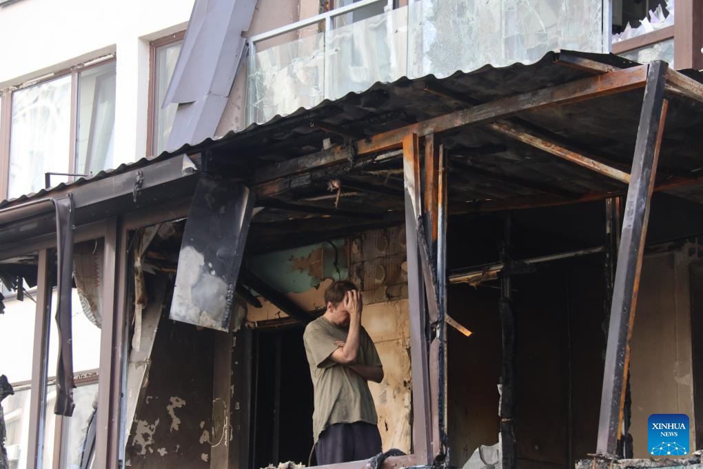 A man stands on the balcony of a damaged residential building in the Shevchenkivskyi district of Kiev, Ukraine, July 21, 2025. Two people were killed and 15 others injured in a wave of Russian missile and drone strikes on Ukraine's capital and the western region of Ivano-Frankivsk early Monday, said Ukrainian authorities.