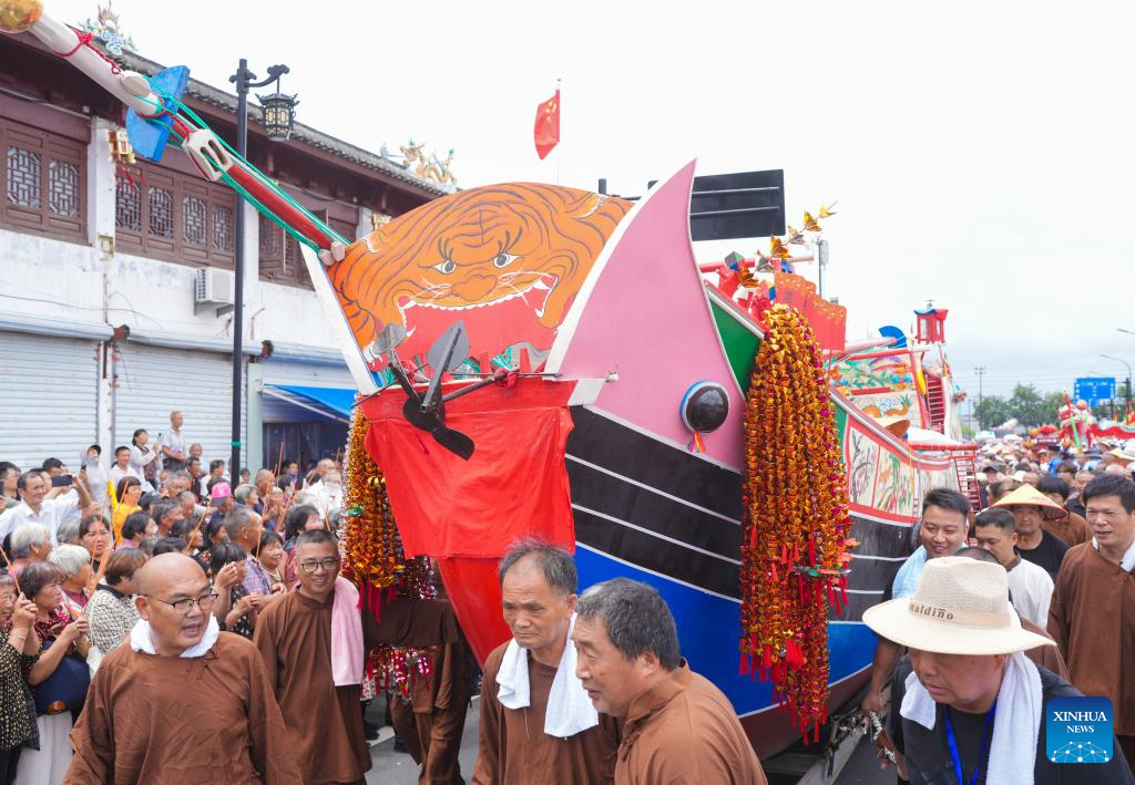 People parade with a ceremonial boat during a traditional ceremony on the occasion of the Dashu solar term in Taizhou, east China's Zhejiang Province, July 22, 2025. People in coastal areas of Taizhou gathered here on Tuesday to hold a traditional ceremony on the occasion of Dashu, or the Great Heat, the 12th of traditional Chinese 24 solar terms. They paraded with a ceremonial boat, shaped like a traditional three-masted vessel, through villages and then burned it after hauling it away from the fishing harbor. In 2021, this ceremony was listed as a national intangible cultural heritage. (Xinhua/Weng Xinyang)