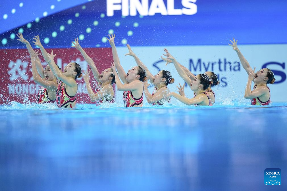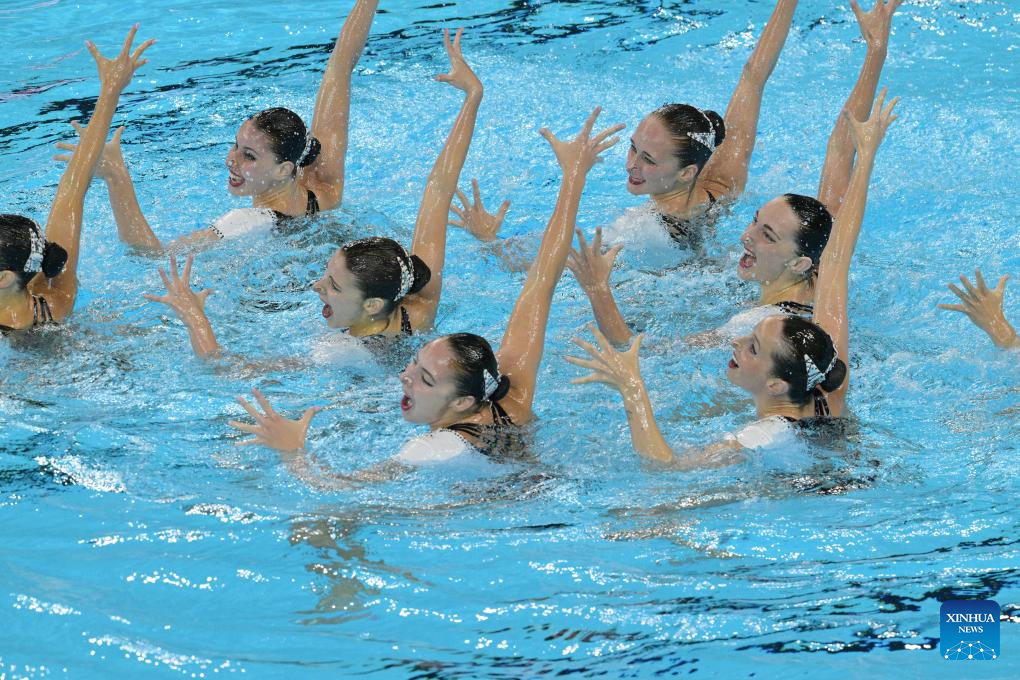 Team Spain compete during the team technical final of artistic swimming at the World Aquatics Championships in Singapore, July 22, 2025. (Xinhua/Xia Yifang)
