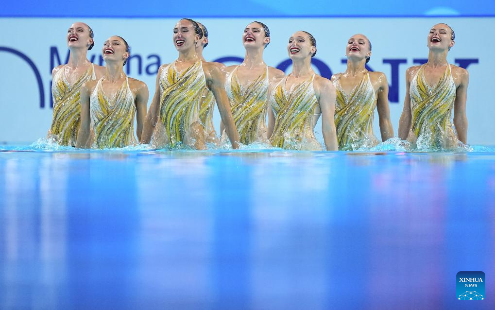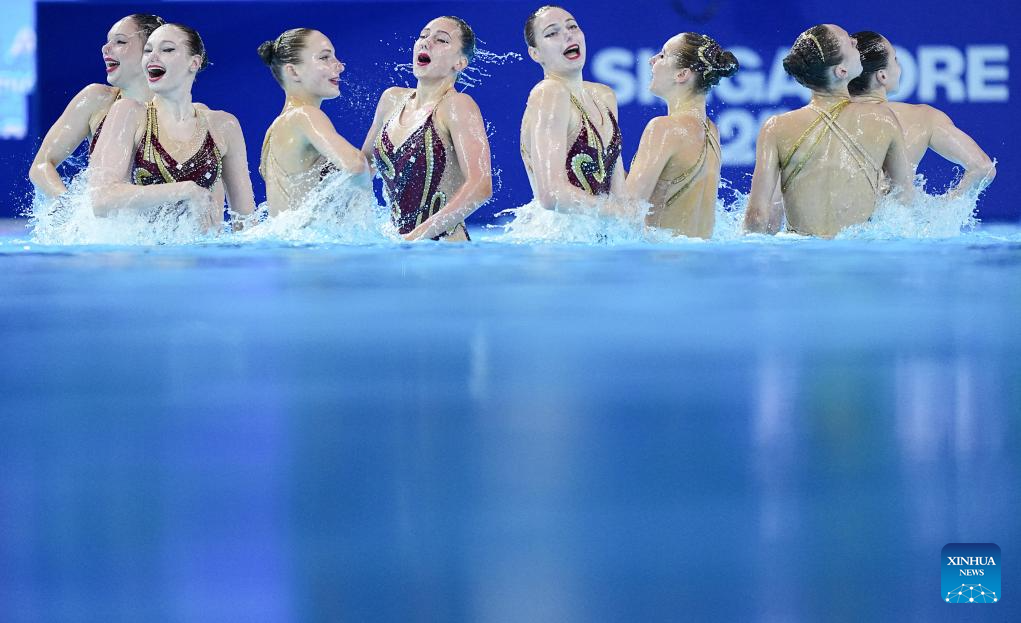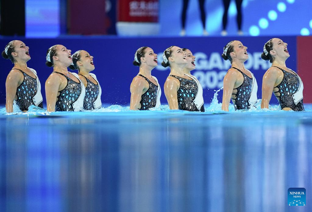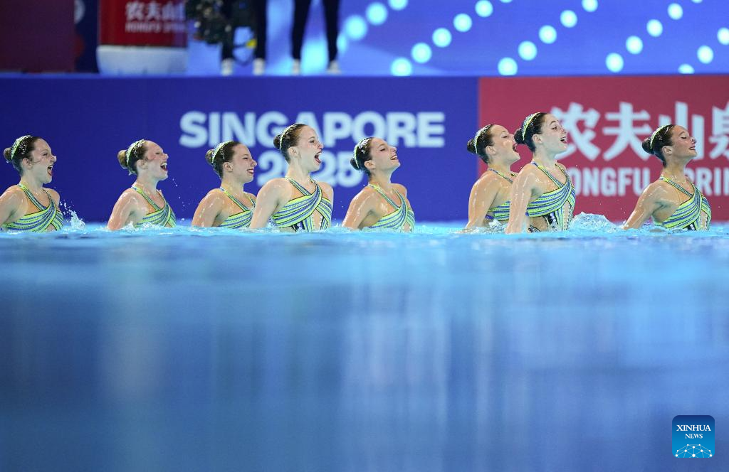 Team Ukraine perform during the team technical final of artistic swimming at the World Aquatics Championships in Singapore, July 22, 2025. (Xinhua/Xia Yifang)