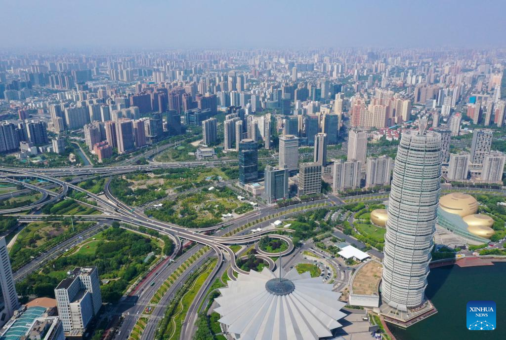 An aerial drone photo taken on July 15, 2025 shows a financial island in Zhengzhou, central China's Henan Province. Located in central China, Zhengzhou is renowned as a regional hub for sci-tech innovation, a national historical and cultural city, and an international comprehensive transportation hub. In recent years, Zhengzhou has been dedicated to promoting high-quality development, enhancing its overall competitiveness, and integrating into the national market.