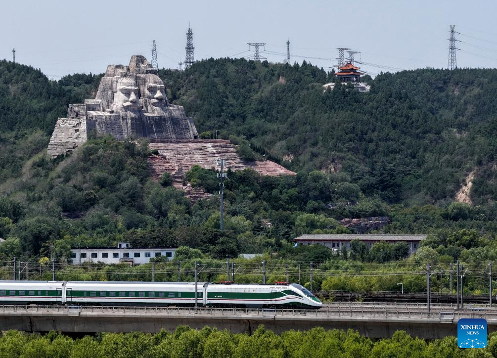 An aerial drone photo taken on July 17, 2025 shows the busts of Yan Emperor and Yellow Emperor, legendary ancestors of the Chinese nation, on the bank of the Yellow River in Zhengzhou, central China's Henan Province. Located in central China, Zhengzhou is renowned as a regional hub for sci-tech innovation, a national historical and cultural city, and an international comprehensive transportation hub. In recent years, Zhengzhou has been dedicated to promoting high-quality development, enhancing its overall competitiveness, and integrating into the national market.