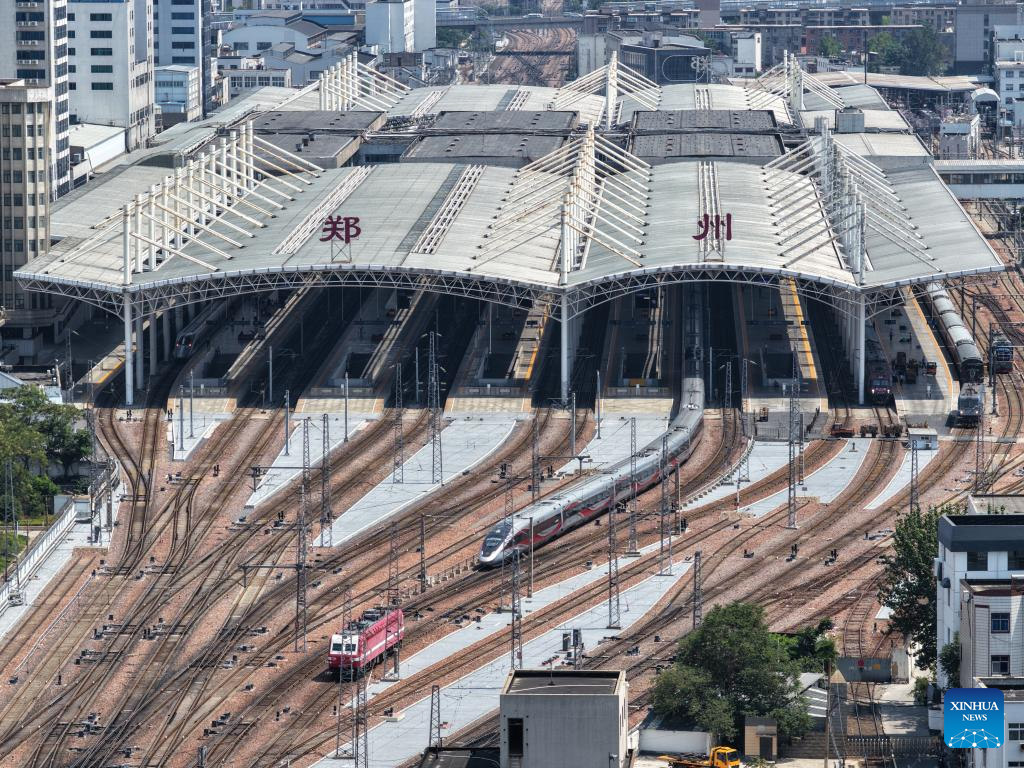 An aerial drone photo taken on July 17, 2025 shows the Zhengzhou Railway Station in Zhengzhou, central China's Henan Province. Located in central China, Zhengzhou is renowned as a regional hub for sci-tech innovation, a national historical and cultural city, and an international comprehensive transportation hub. In recent years, Zhengzhou has been dedicated to promoting high-quality development, enhancing its overall competitiveness, and integrating into the national market.