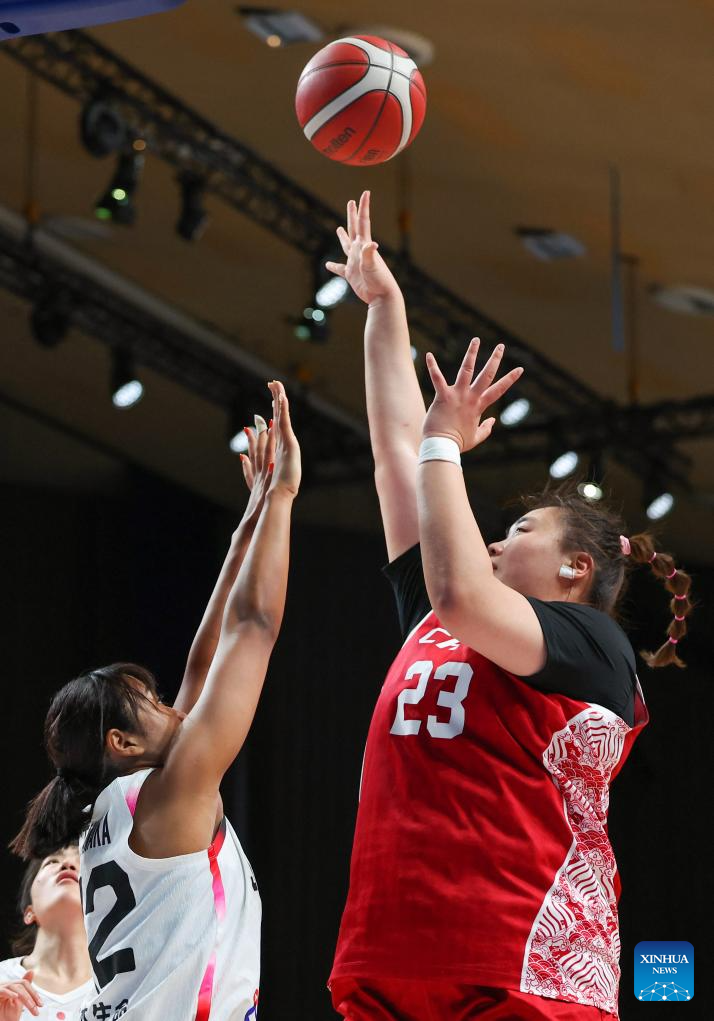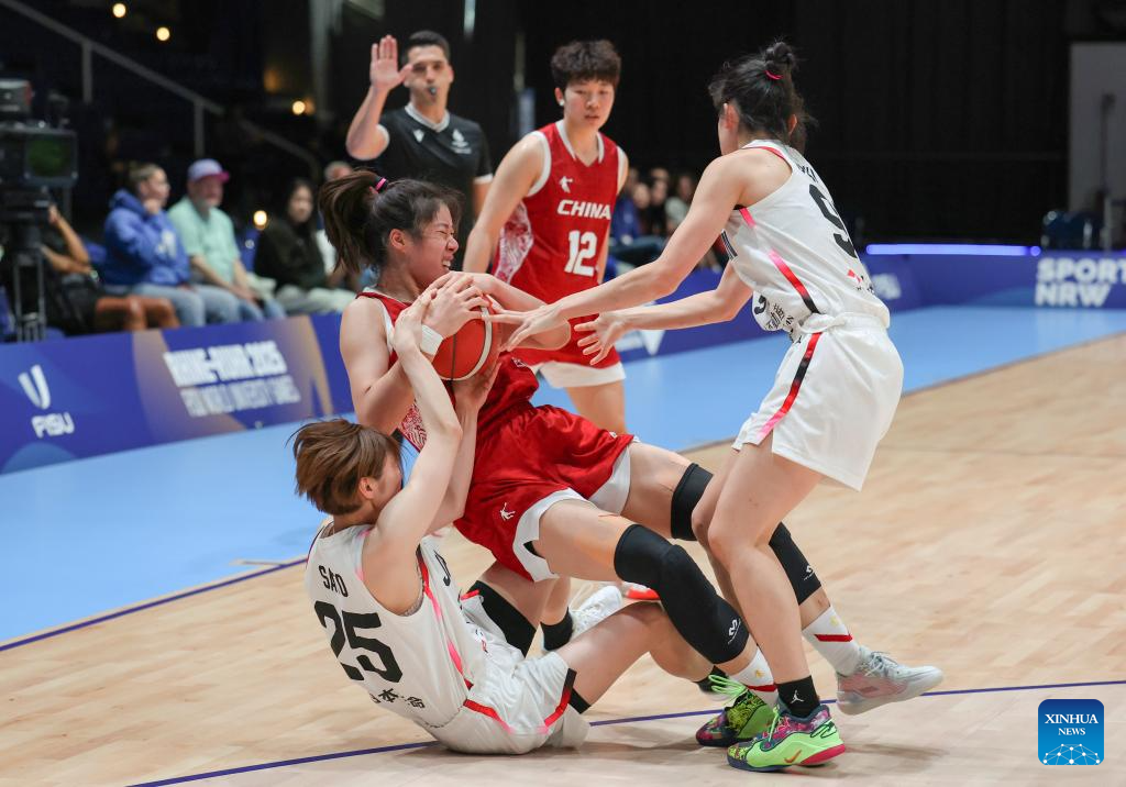 Cao Boyi (L) of China grabs the ball during the women's basketball quaterfinal match between China and Japan at the Rhine-Ruhr 2025 FISU World University Games in Essen, Germany, July 22, 2025. (Xinhua/Zhang Fan)