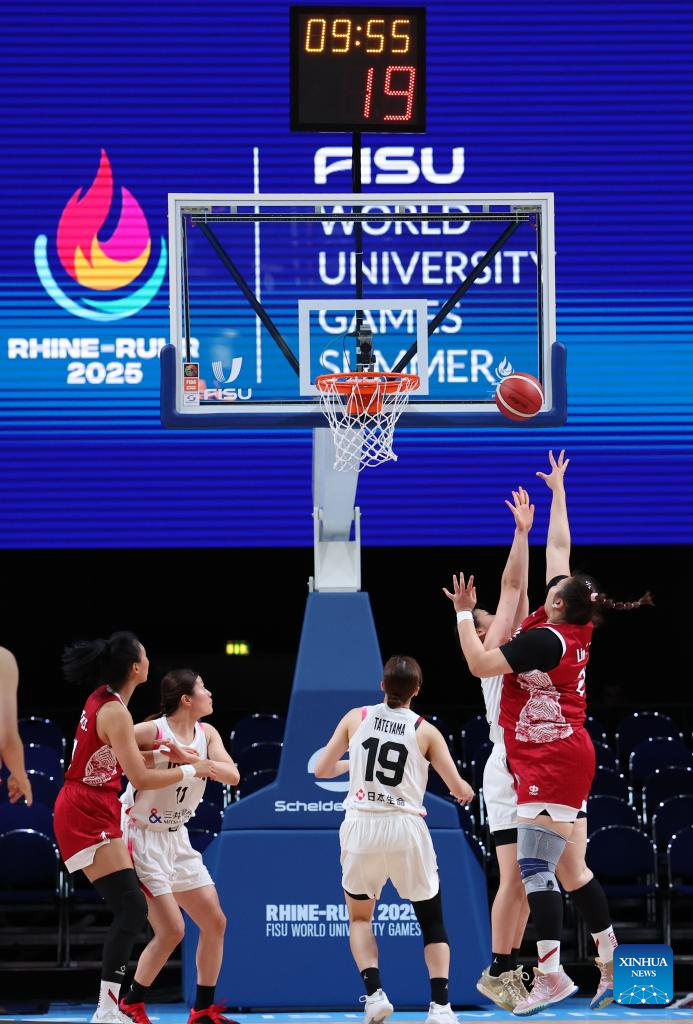 Tang Ziting (C) of China shoots during the women's basketball quaterfinal match between China and Japan at the Rhine-Ruhr 2025 FISU World University Games in Essen, Germany, July 22, 2025. (Xinhua/Zhang Fan)