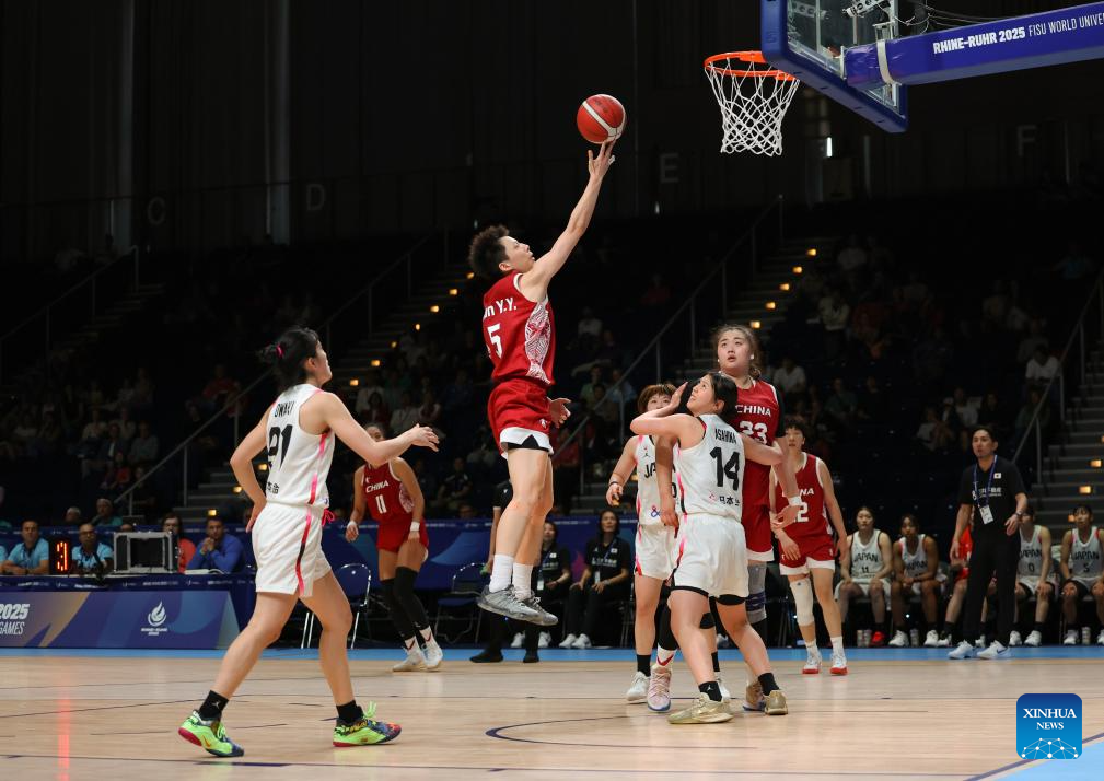 Chen Yujie (1st L) of China catches the ball during the women's basketball quaterfinal match between China and Japan at the Rhine-Ruhr 2025 FISU World University Games in Essen, Germany, July 22, 2025. (Xinhua/Zhang Fan)