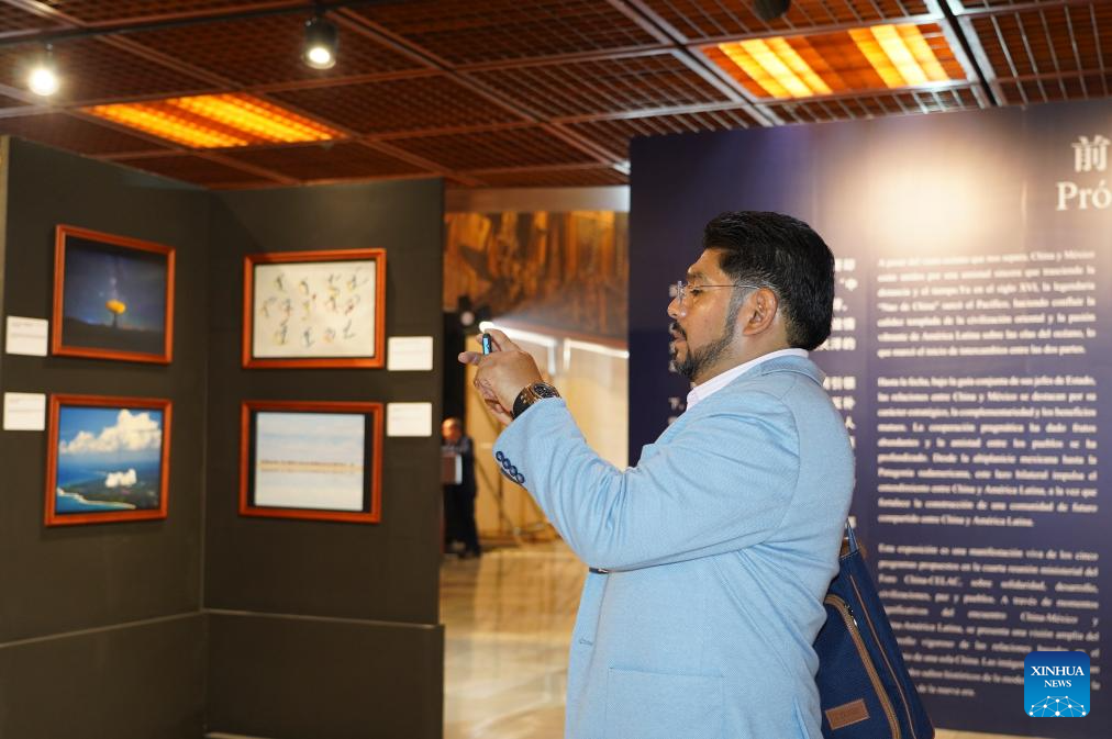 A visitor takes photos at a news photo exhibition in Mexico City, Mexico, July 18, 2025. The news photo exhibition, co-organized by Xinhua News Agency and the Mexican Chamber of Deputies, kicked off here on July 18. (Xinhua/Li Mengxin)