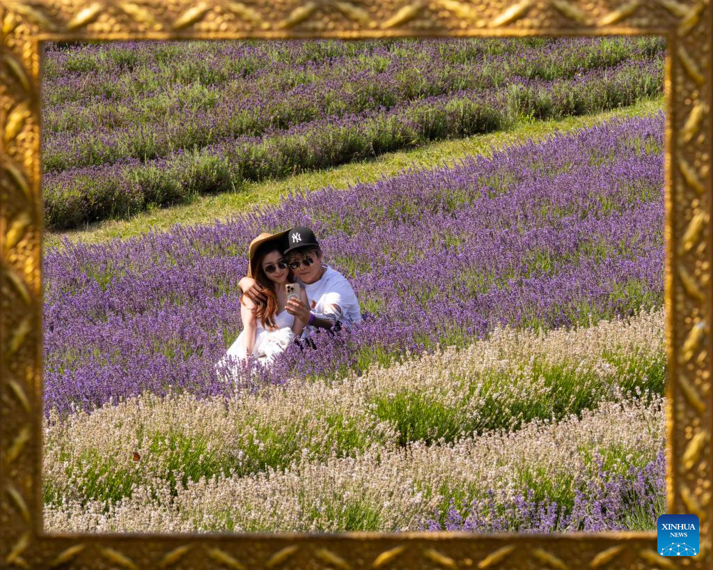 Visitors taking a selfie among lavender blossoms are seen through a frame at a lavender field in Milton, Ontario, Canada, on July 22, 2025. (Photo by Zou Zheng/Xinhua)