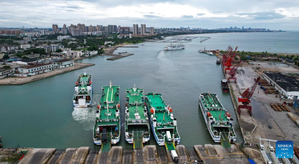 An aerial drone photo taken on July 22, 2025 shows a view of Xiuying Port in Haikou, south China's Hainan Province. The passenger and freight ferry service in the Qiongzhou Strait has been resumed in an orderly manner as the impact of Typhoon Wipha weakens. (Xinhua/Yang Guanyu)