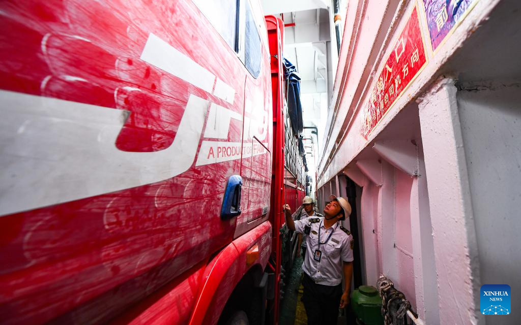 A truck drives into a ferry ship at Xiuying Port in Haikou, south China's Hainan Province, July 22, 2025. The passenger and freight ferry service in the Qiongzhou Strait has been resumed in an orderly manner as the impact of Typhoon Wipha weakens. (Xinhua/Yang Guanyu)