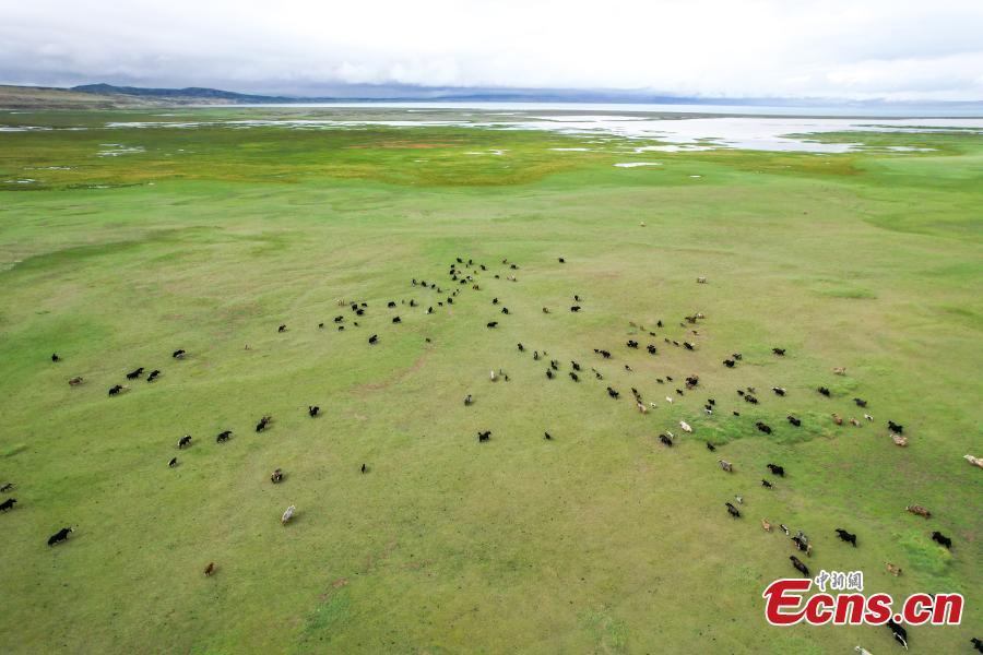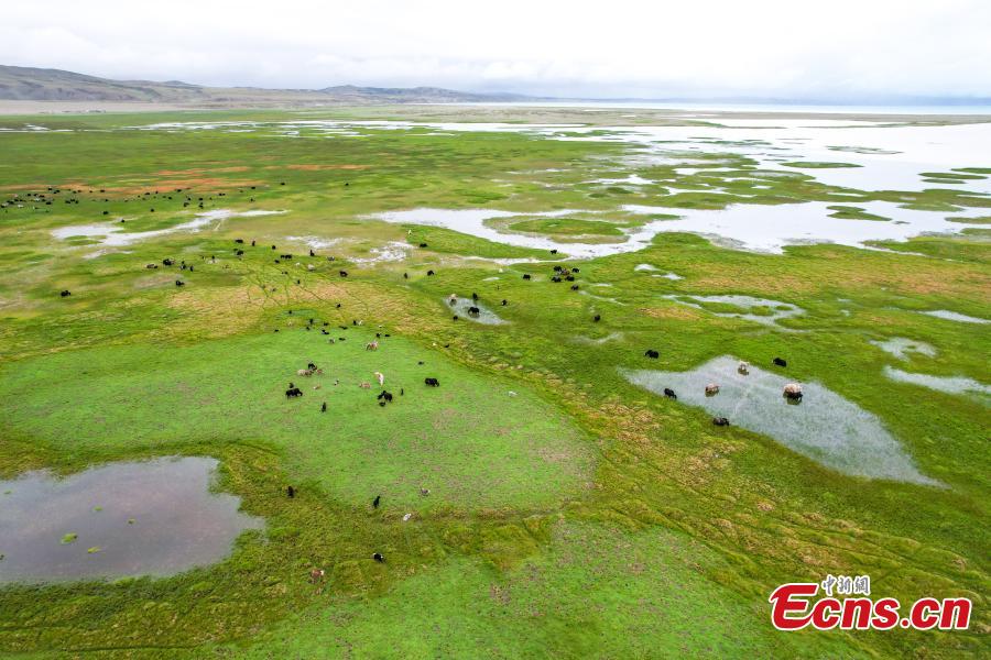 Photo take on July 22, 2025 shows a herd of yaks in a wetland near Mapam Yumco Lake in Burang County of Ngari Prefecture, southwest China's Xizang Autonomous Region. (Photo/China News Service)