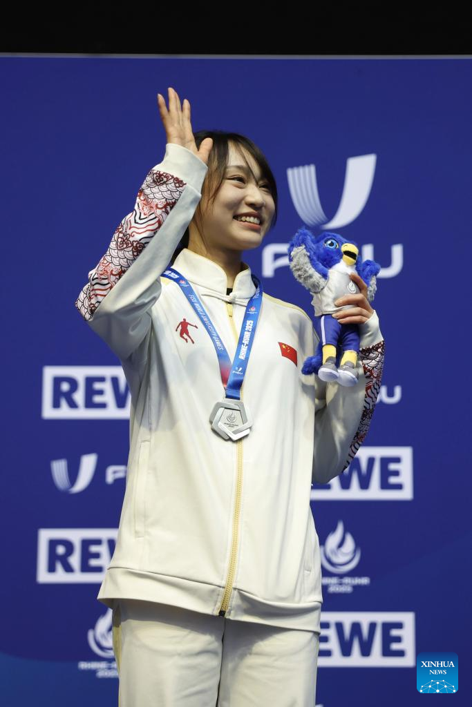 Silver medalist Wang Yi of China celebrates during the awarding ceremony for women's 1m springboard of diving at the Rhine-Ruhr 2025 FISU World University Games in Berlin, Germany, July 23, 2025. (Xinhua/Du Zheyu)