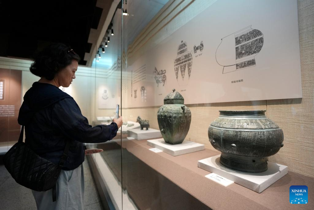 A tourist takes photos of the exhibited bronze wares unearthed from Hanzhong at the Hanzhong Museum in Hanzhong, northwest China's Shaanxi Province, July 22, 2025. Hanzhong is nestled between the Qinling and Daba Mountains, with the Hanjiang River, a tributary of the Yangtze River, flowing through the city. For more than 2,300 years, it has served as a vital nexus for the river network and transportation routes connecting the north and south. The city is rich in resources and, unlike other areas in Shaanxi, it shows distinct characteristics in dialect and culinary traditions influenced by southwest China's Sichuan. (Xinhua/Li Yibo)