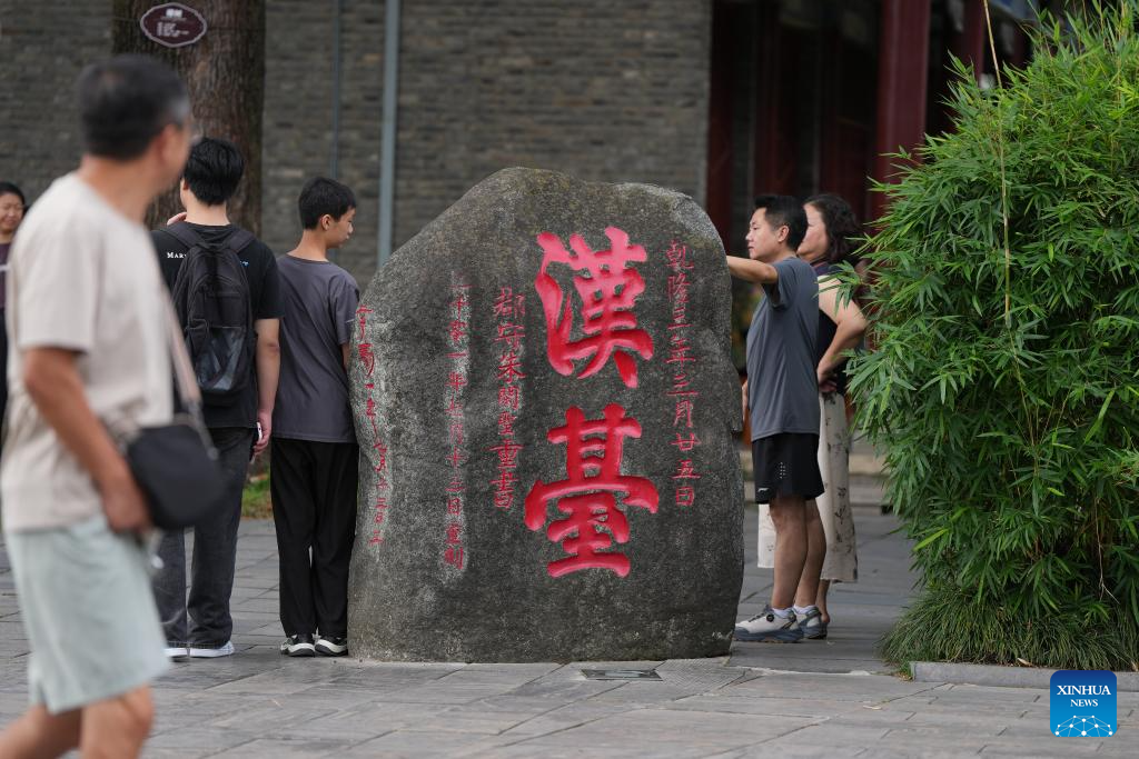 Tourists visit the Hanzhong Museum in Hanzhong, northwest China's Shaanxi Province, July 22, 2025. Hanzhong is nestled between the Qinling and Daba Mountains, with the Hanjiang River, a tributary of the Yangtze River, flowing through the city. For more than 2,300 years, it has served as a vital nexus for the river network and transportation routes connecting the north and south. The city is rich in resources and, unlike other areas in Shaanxi, it shows distinct characteristics in dialect and culinary traditions influenced by southwest China's Sichuan. (Xinhua/Li Yibo)