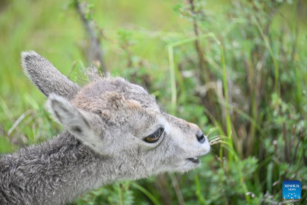 A rescued bharal grazes at the Wildlife Rehabilitation and Breeding Station in Qilian Mountain National Park in northwest China's Qinghai Province, July 23, 2025. The Wildlife Rehabilitation and Breeding Station sits at an altitude of nearly 3,000 meters at the foot of the Qilian Mountains. The station is mainly responsible for wildlife rescue, population monitoring, post-release tracking, public education, and nature-based learning.