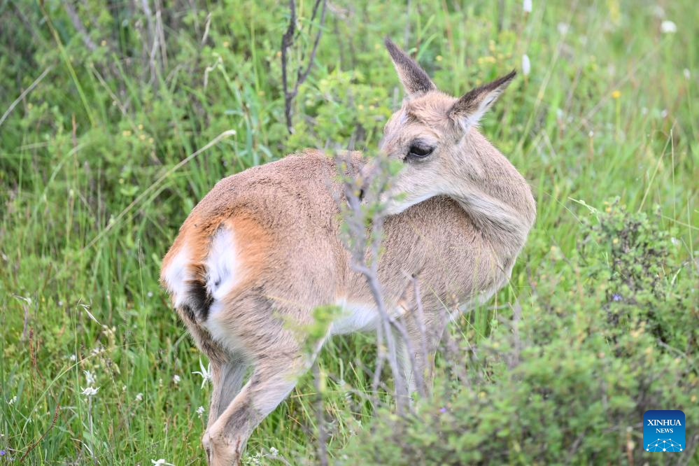 A rescued Tibetan gazelle is seen at the Wildlife Rehabilitation and Breeding Station in Qilian Mountain National Park in northwest China's Qinghai Province, July 23, 2025. The Wildlife Rehabilitation and Breeding Station sits at an altitude of nearly 3,000 meters at the foot of the Qilian Mountains. The station is mainly responsible for wildlife rescue, population monitoring, post-release tracking, public education, and nature-based learning.