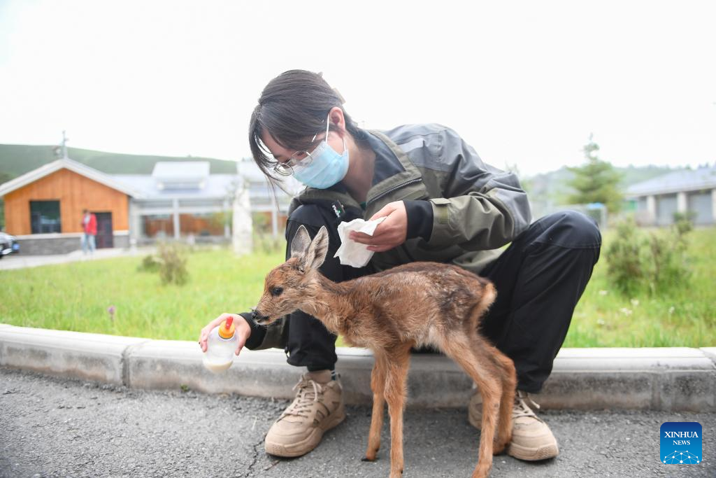 Xu Fengyi, technician of the Wildlife Rehabilitation and Breeding Station, breeds a rescued roe deer fawn at the station in Qilian Mountain National Park in northwest China's Qinghai Province, July 23, 2025. The Wildlife Rehabilitation and Breeding Station sits at an altitude of nearly 3,000 meters at the foot of the Qilian Mountains. The station is mainly responsible for wildlife rescue, population monitoring, post-release tracking, public education, and nature-based learning.