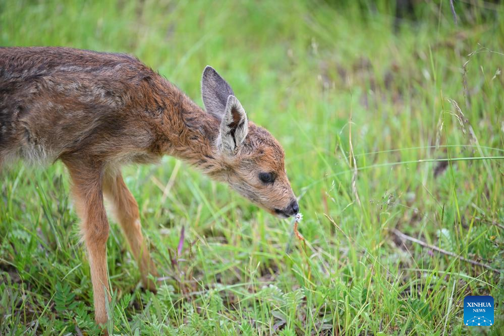 A rescued roe deer fawn grazes at the Wildlife Rehabilitation and Breeding Station in Qilian Mountain National Park in northwest China's Qinghai Province, July 23, 2025. The Wildlife Rehabilitation and Breeding Station sits at an altitude of nearly 3,000 meters at the foot of the Qilian Mountains. The station is mainly responsible for wildlife rescue, population monitoring, post-release tracking, public education, and nature-based learning.