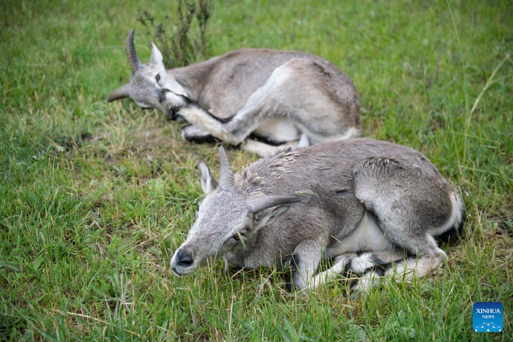 Two rescued bharals rest at the Wildlife Rehabilitation and Breeding Station in Qilian Mountain National Park in northwest China's Qinghai Province, July 23, 2025. The Wildlife Rehabilitation and Breeding Station sits at an altitude of nearly 3,000 meters at the foot of the Qilian Mountains. The station is mainly responsible for wildlife rescue, population monitoring, post-release tracking, public education, and nature-based learning.