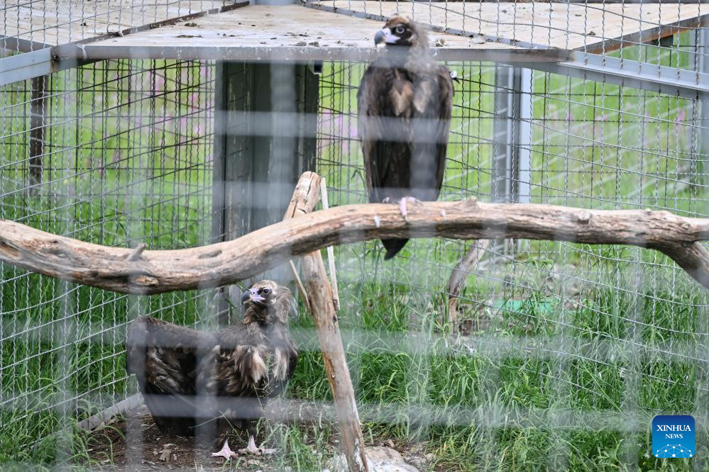 Two rescued vultures are seen at the Wildlife Rehabilitation and Breeding Station in Qilian Mountain National Park in northwest China's Qinghai Province, July 23, 2025. The Wildlife Rehabilitation and Breeding Station sits at an altitude of nearly 3,000 meters at the foot of the Qilian Mountains. The station is mainly responsible for wildlife rescue, population monitoring, post-release tracking, public education, and nature-based learning.