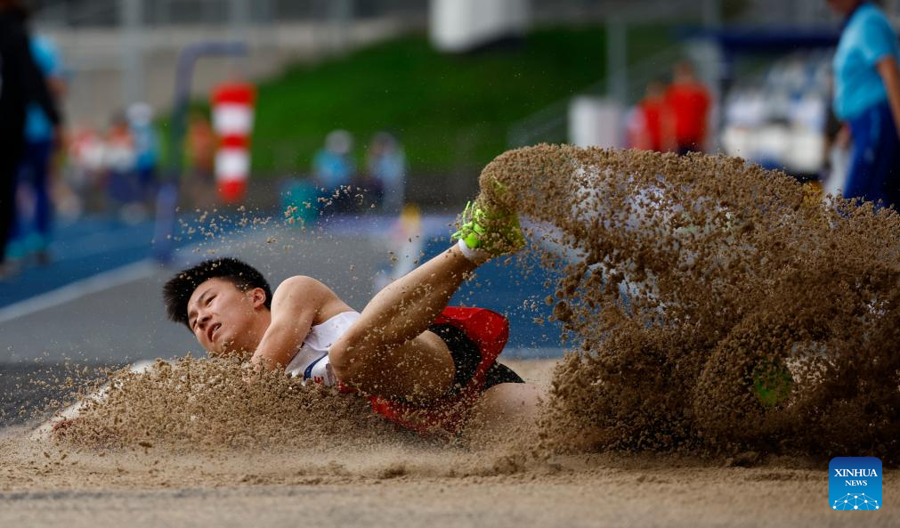 Shu Heng of China competes during the men's long jump final at the Rhine-Ruhr 2025 FISU World University Games in Bochum, Germany, July 24, 2025. (Xinhua/Li Ying)