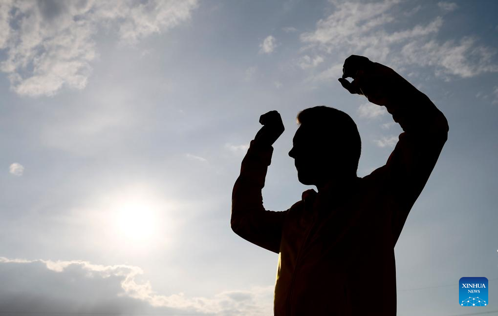 Shu Heng of China celebrates after the men's long jump final at the Rhine-Ruhr 2025 FISU World University Games in Bochum, Germany, July 24, 2025. (Xinhua/Li Ying)
