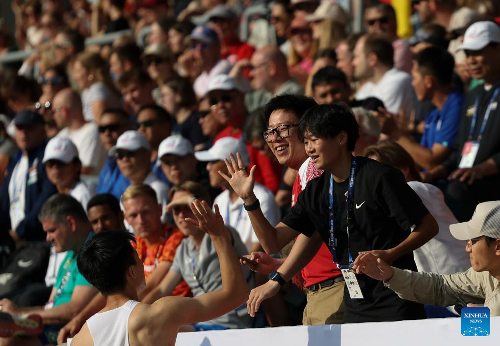Shu Heng (C) of China celebrates after the men's long jump final at the Rhine-Ruhr 2025 FISU World University Games in Bochum, Germany, July 24, 2025. (Xinhua/Hu Xingyu)